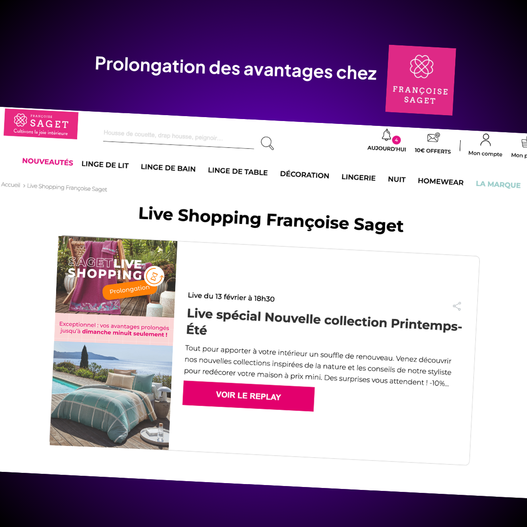 Ajoutez un lien vers le replay, insérez des extraits vidéo (hello les shorts !), mettez en avant les produits phares présentés et n’hésitez pas à intégrer un code promo exclusif pour encourager l’achat. Françoise Saget prolonge leurs offres exclusives pour quelques jours après le live.