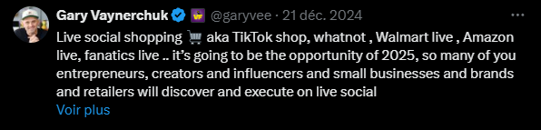 Le live shopping n’est pas une simple tendance passagère, c’est une véritable révolution dans la manière de consommer et d’interagir avec les marques. Comme le dit Gary Vaynerchuk dans un tweet récent : « Le live social shopping va être l’opportunité de 2025. »