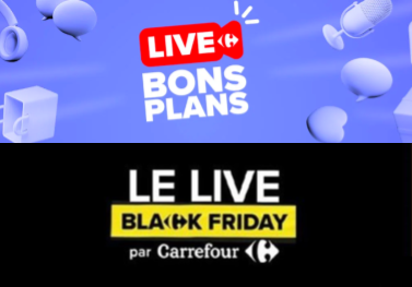 Carrefour Live, comme Boulanger, appose la mention “Live” à côté de son logo minimaliste, le modifiant selon les types de Live Shopping, que ce soient des “Bons plans” ou des Live dédiés à des événements comme le Black Friday ou les fêtes de fin d’année.