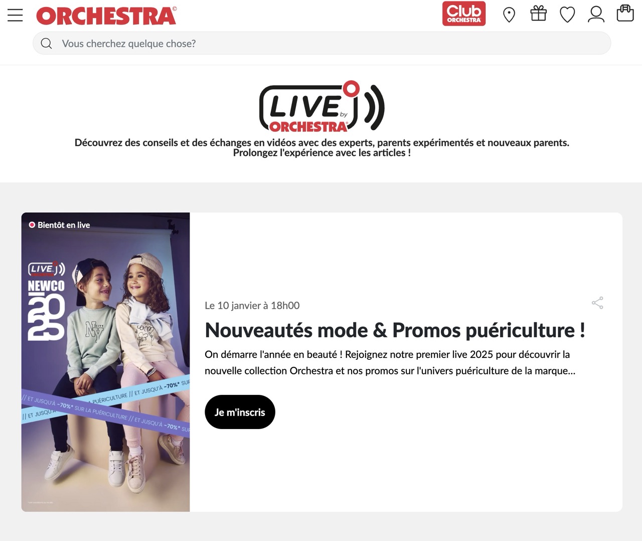 Avec Orchestra, c’est la rencontre avec un acteur historique de la puériculture et de la mode enfantine. Ensemble, on veut proposer bien plus qu’un simple live shopping : un vrai espace d’échange et de convivialité où chacun peut piocher l’info ou l’inspiration dont il a besoin.