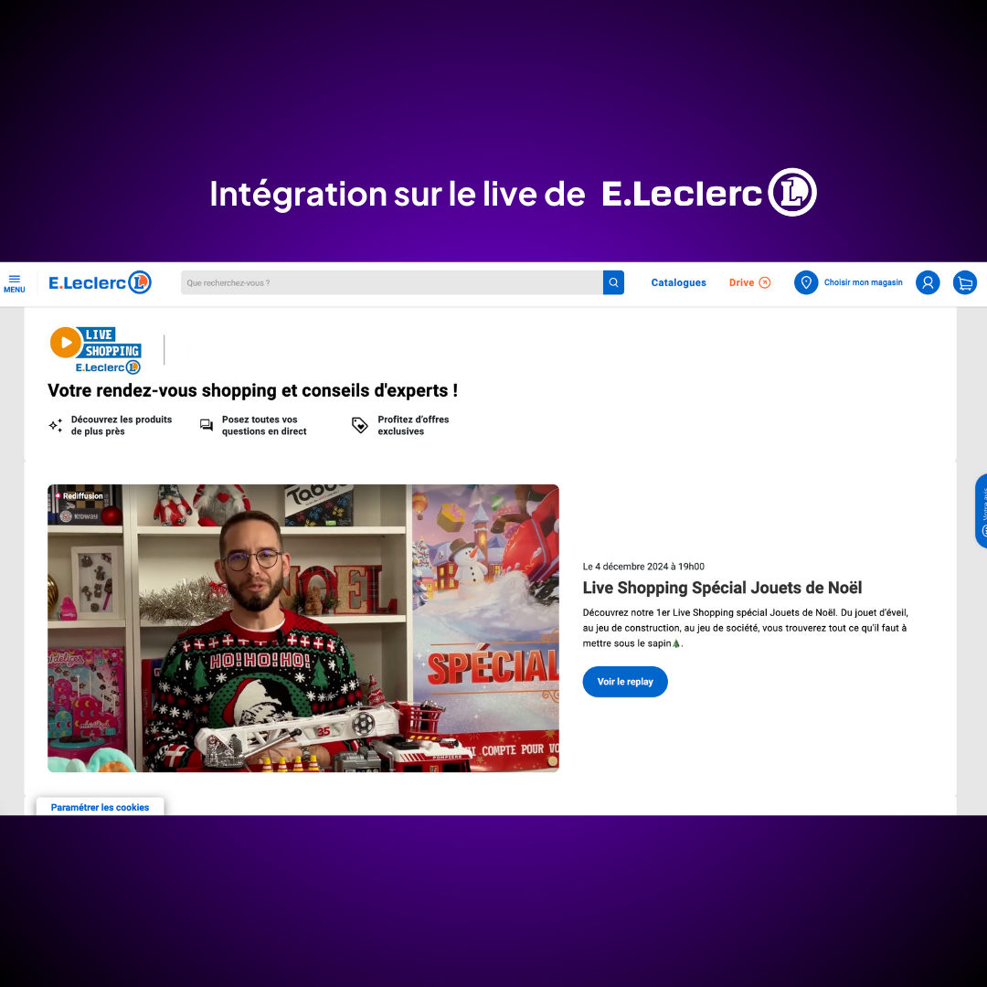 L'un de nos principaux atouts réside dans notre capacité à s'intégrer facilement sur n'importe quel site e-commerce. Sans nécessiter de développement spécifique, la solution peut être déployée rapidement, ce qui rend l’expérience du Liveshopping accessible même aux petites entreprises. Cette intégration se fait de manière cohérente dans le parcours client, que ce soit sur des pages dédiées ou directement sur les fiches produits.