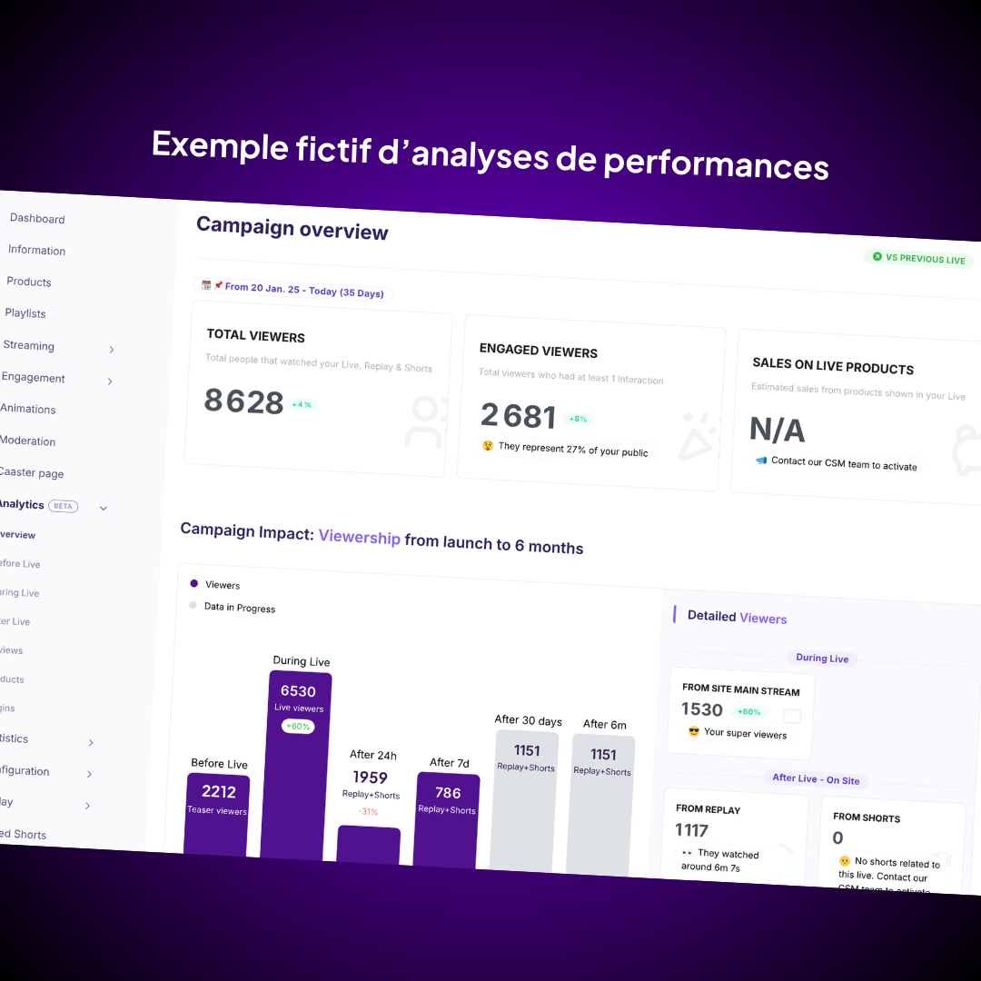 Au-delà de la technologie, Caast offre un accompagnement complet, de la préparation stratégique à la production du live, en passant par l'analyse des performances. Après chaque session, une interface dédiée permet de suivre des indicateurs clés tels que le nombre de vues, le taux d’engagement ou encore l’ajout au panier.