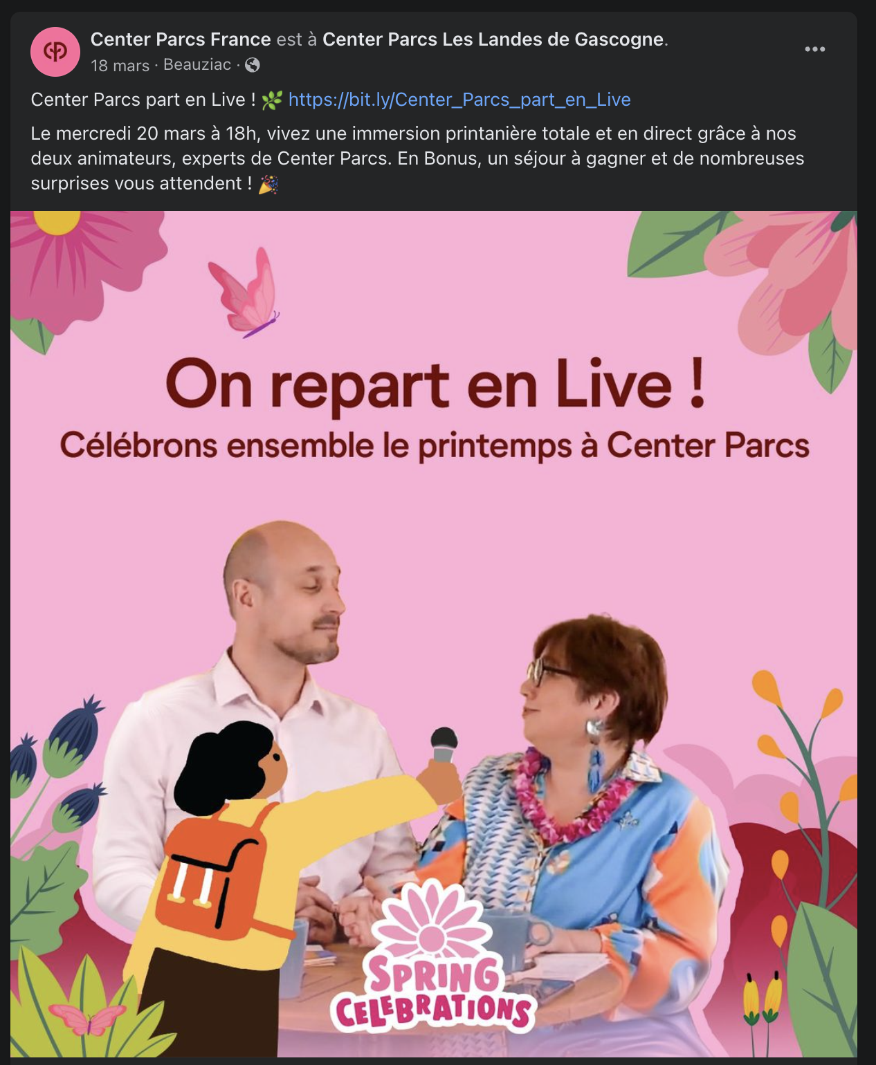 Pour son Live de Mars à l’occasion de l’ouverture du Printemps, Center Parcs mobilise des clients et prospects avec des posts sur les Réseaux Sociaux mettant en avant ses animateurs récurrents.