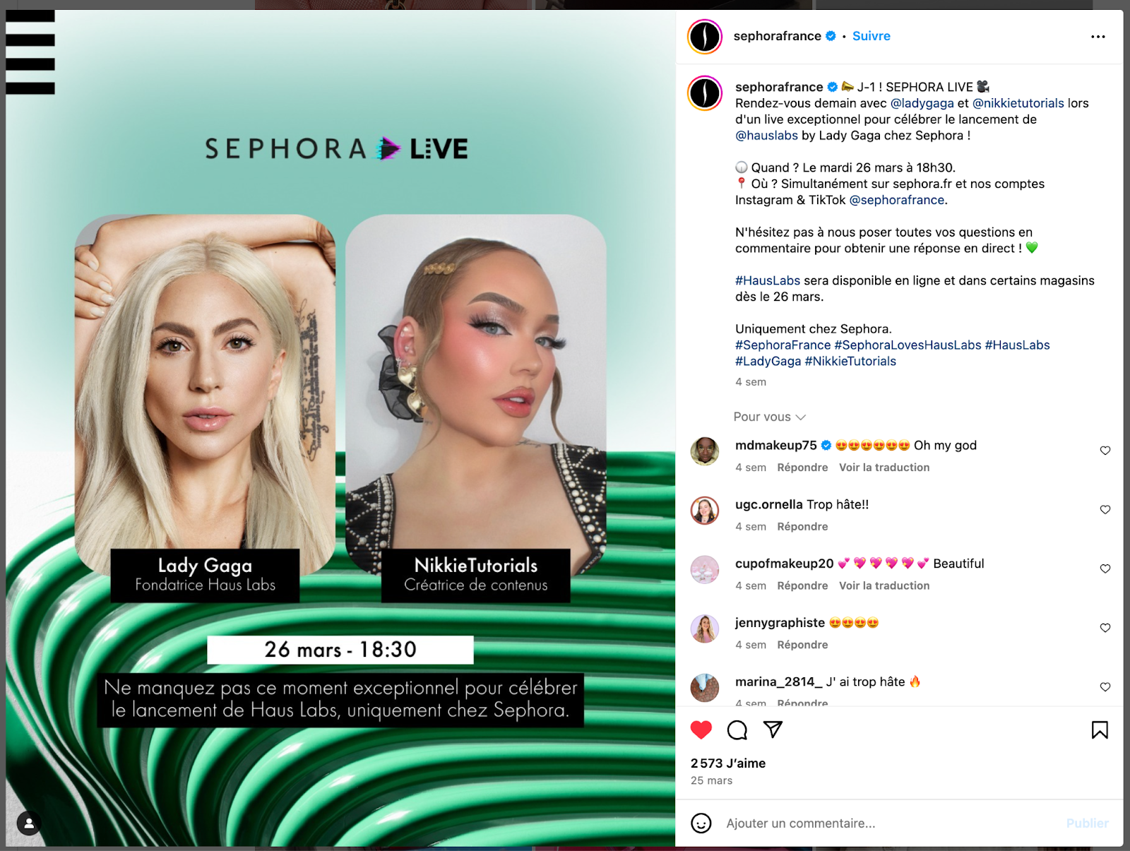 Ce lancement de la marque de la star Lady Gaga a été promu par Sephora sur ses Réseaux Sociaux, avec une planification importante : le Live Shopping a été programmé pour le lendemain du lancement de la marque avec des influenceurs, dont Nikkie Tutorials, qui présente ce Live Shopping.